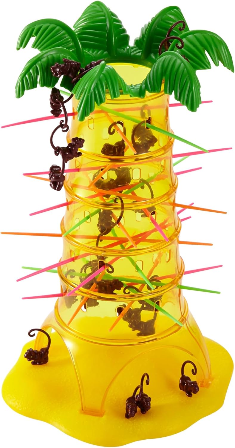 Dans ce jeu, un arbre creux est rempli de petits singes. Chaque joueur insère un bâtonnet coloré dans les fentes de l’arbre sans faire tomber les singes. Celui qui fait tomber le moins de singes gagne !