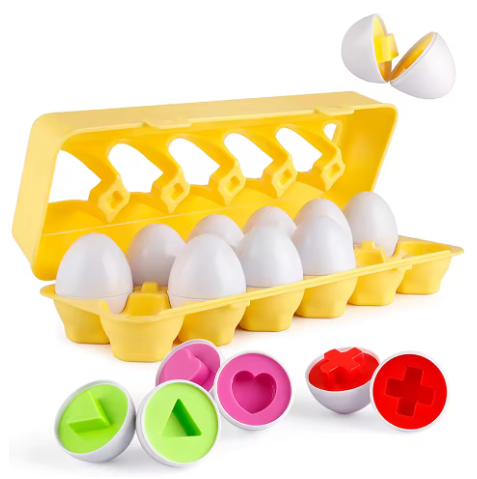 🧩 12 œufs assortis forme + couleur : chaque œuf contient une forme géométrique différente et une couleur vibrante à associer